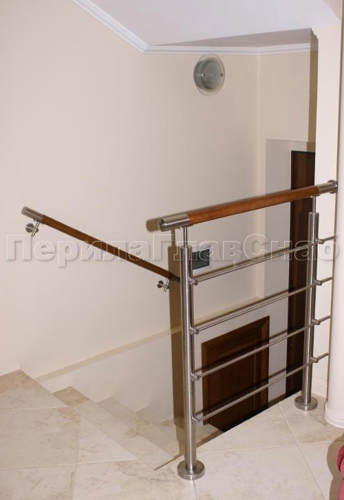 Нержавеющие ограждения без ригелей с круглым поручнем и стойками с деревянными вставками