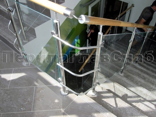 Ограждение лестницы со стеклом, тонированным в массе, стойки и завязки поручня из латуни