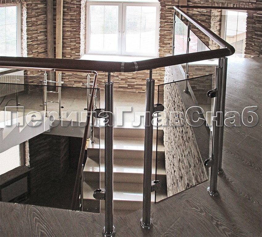 Три ригеля на держателях, квадратный деревянный поручень и круглые стойки