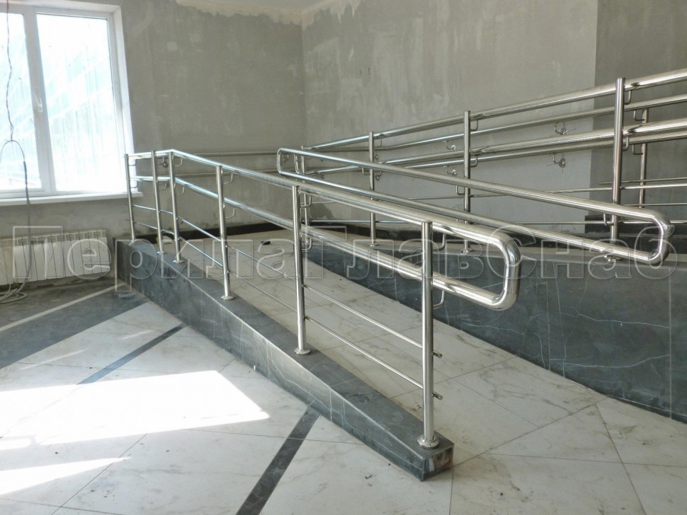 сдвоенный, из круглой нержавеющей трубы диаметром 38,1 мм. Нижний и верхний поручни завязаны при помощи отводов. Поручень может крепиться на выносные держатели.