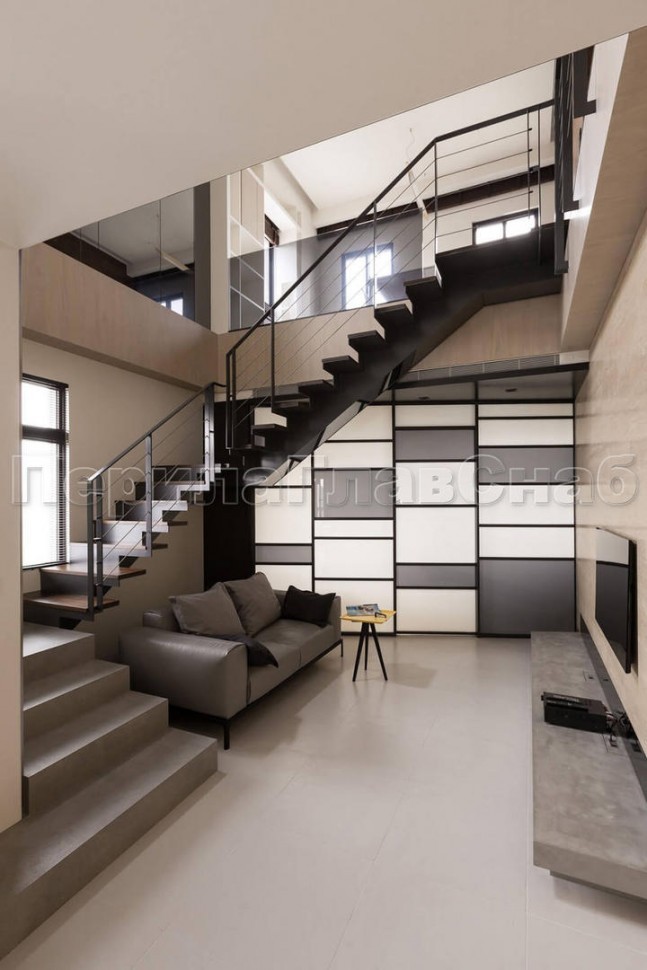 Ограждение лестницы со стеклом, тонированным в массе, стойки и завязки поручня из латуни