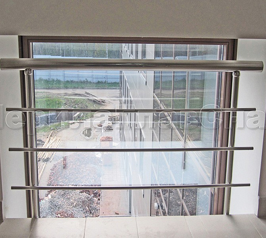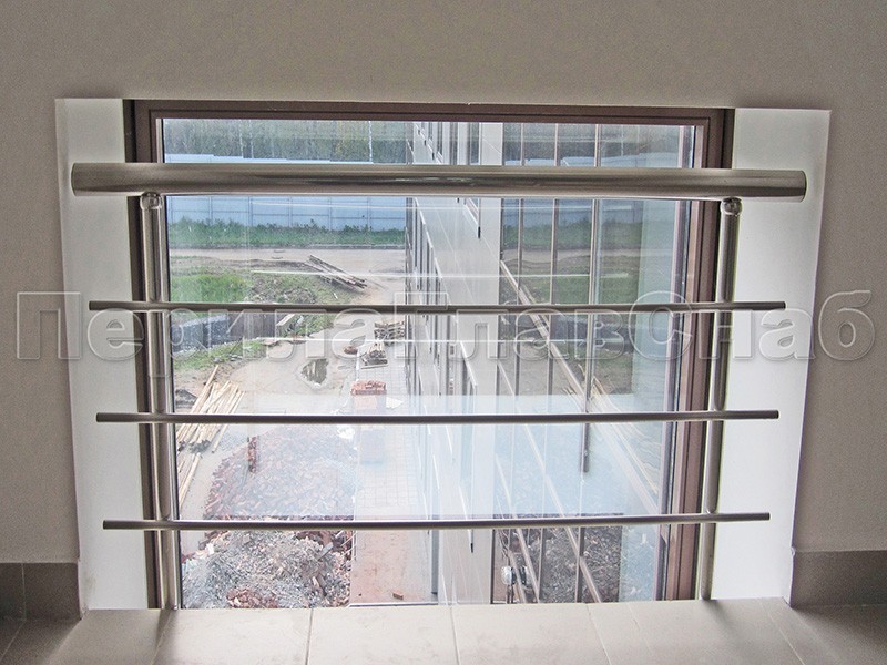 Надежное и простое ограждение оконных проемов из нержавейки. Крепление в торец позволяет сохранить место в условиях узких лестничных маршей.