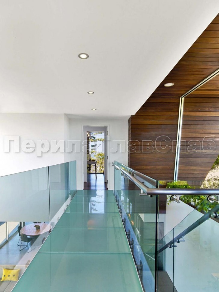 Ограждение с деревянным поручнем на выносе на точечном креплении на лестнице