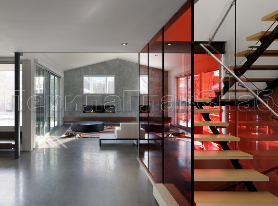 Ограждение с профильным поручнем с пазом на точечном креплении на лестнице