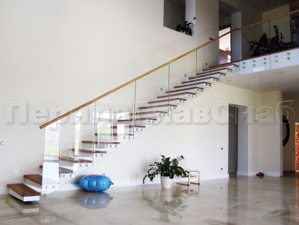 Ограждение с деревянным поручнем на точечном креплении на лестнице
