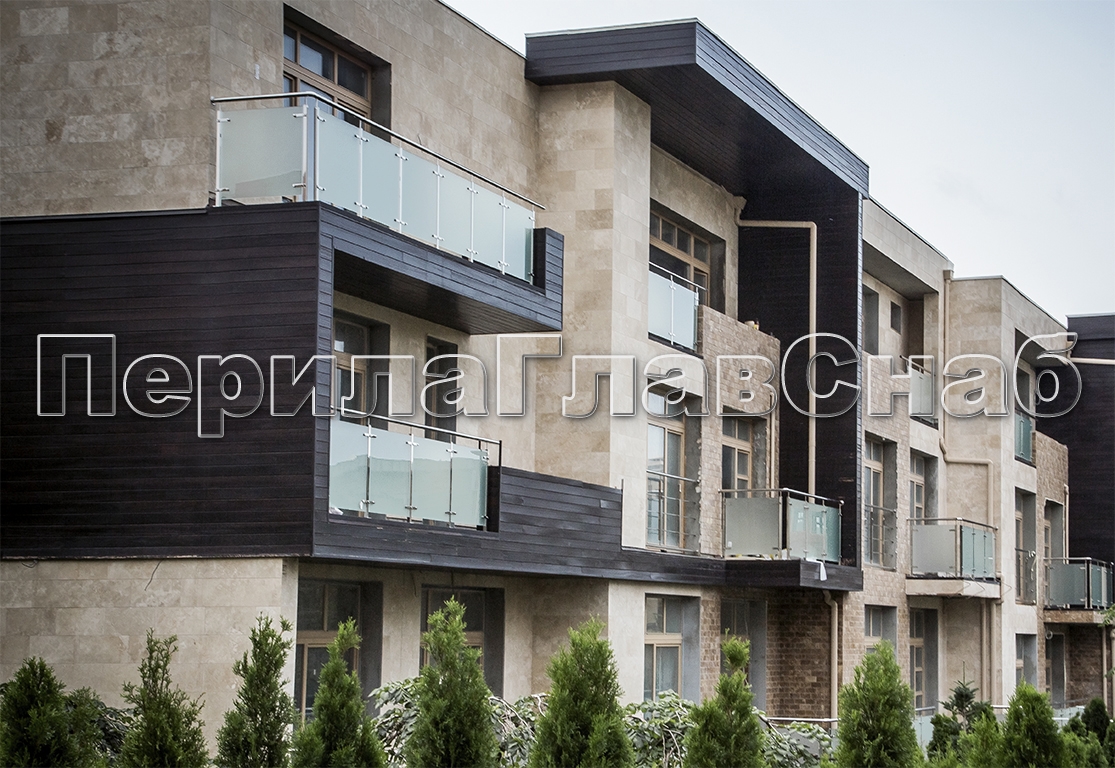 Ограждение с деревянным поручнем с зажимными стеклодержателями и стойками в Краснодаре. Готовые проекты ПерилаГлавСнаб