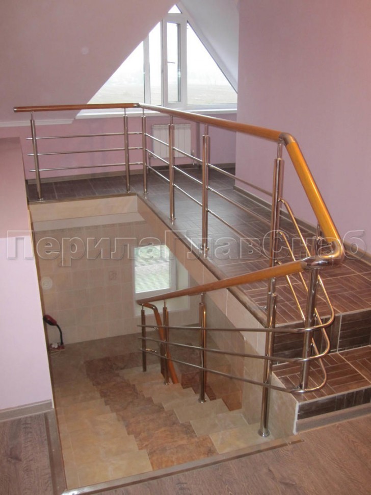 Три ригеля на сварке, квадратный деревянный поручень и круглые стойки