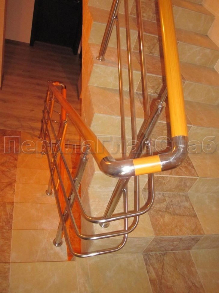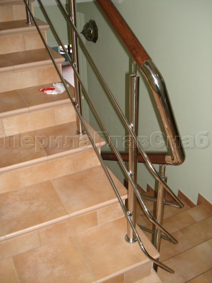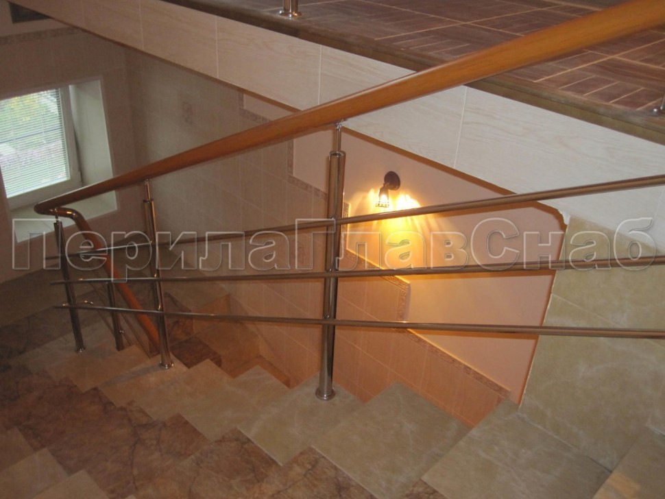 Нержавеющие ограждения без ригелей с круглым поручнем и стойками с деревянными вставками