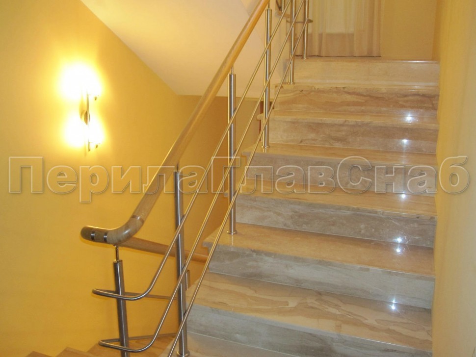 Нержавеющие ограждения без ригелей с круглым деревянным поручнем и стойками с деревянными вставками