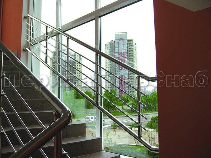 Четыре ригеля на держателях, круглый поручень и квадратные стойки