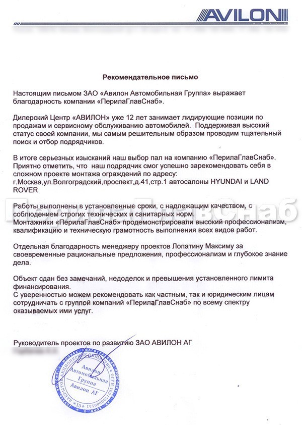 Настоящим письмом ЗАО «Авилон Автомобильная Группа» выражает благодарность компании «ПерилаГлавСнаб».
