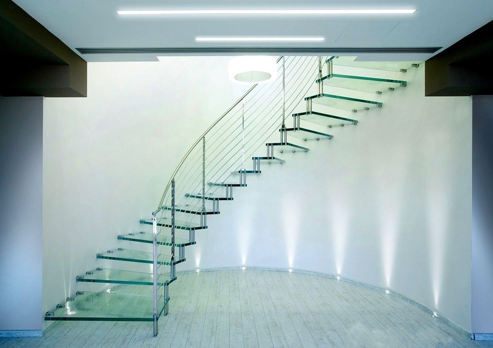 Лестницу из закаленного стекла можно с легкостью вписать в любой стилистический контекст. В минималистичном интерьере лучшими компаньонами для нее могут быть двери стеклянные раздвижные, металлические стеллажи и футуристичное освещение. Стеклянная лестница уместна и в других интерьерах, поскольку придаст им пикантное эклектичное звучание.