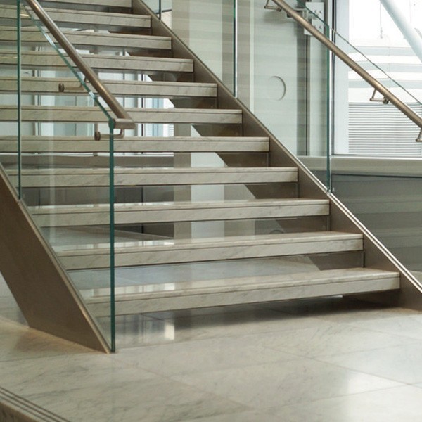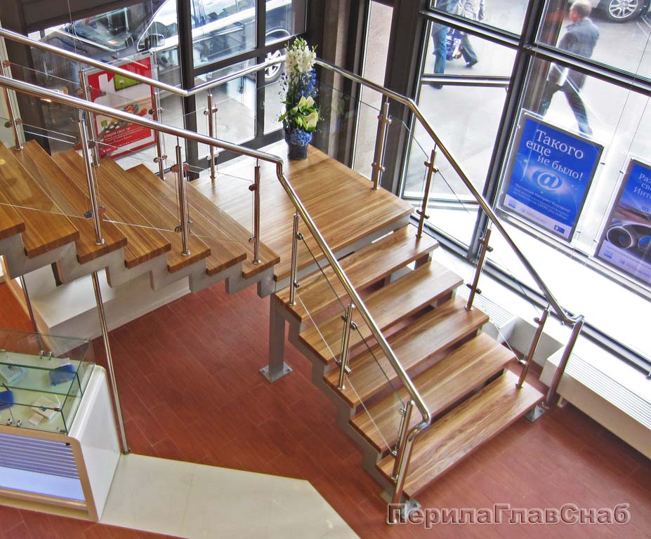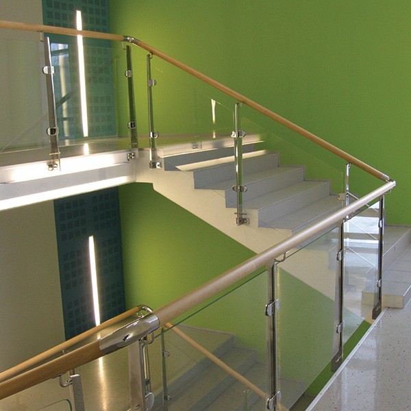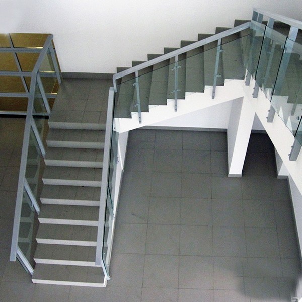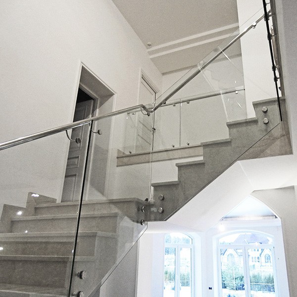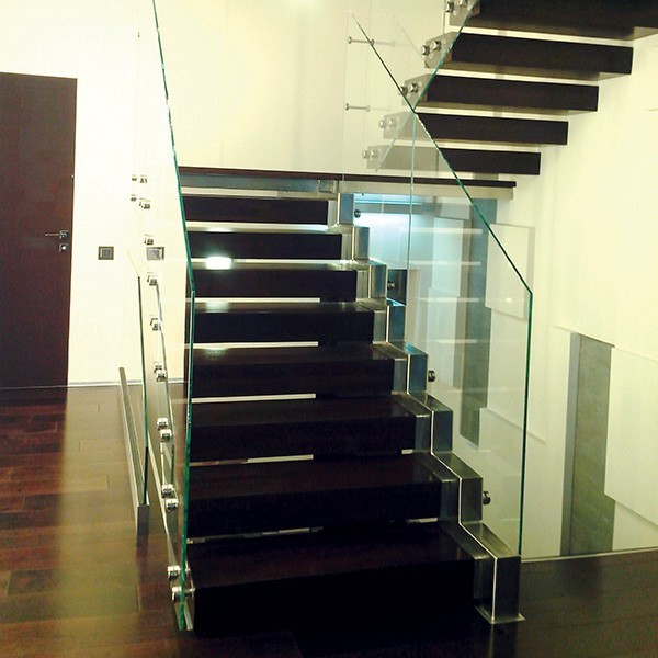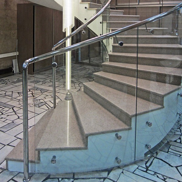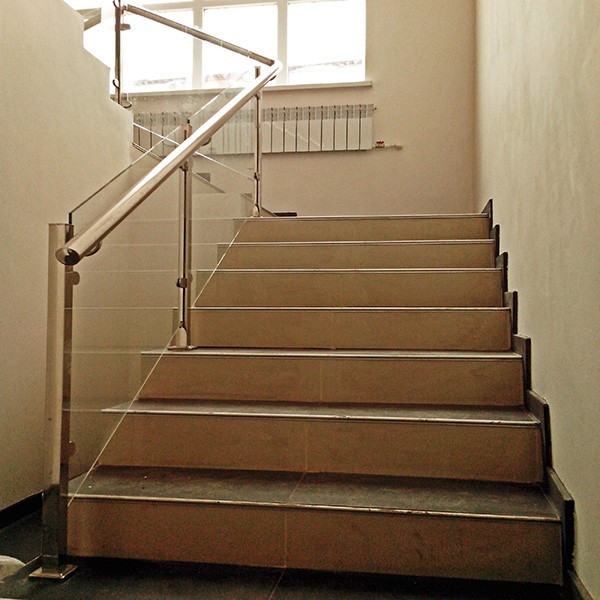 Мы готовы изготовить классическое ограждение лестниц из стекла и нержавеющей стали маршевого типа. Данная конструкция может быть монолитной (например, бетонной), или выполненной на косоурах или больцах. Лестничное ограждение маршевого типа из нержавеющей стали и стекла строится на основе маршей с разным углом наклона. Для облегчения подъема по данной конструкции создаются специальные поворотные плоские площадки, которые могут соединяться забежными ступенями.