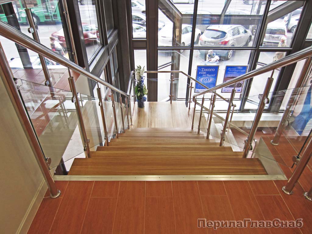 Ограждение для лестницы из нержавейки с зажимными стеклодержателями для крыльца в Краснодаре. Готовые проекты ПерилаГлавСнаб