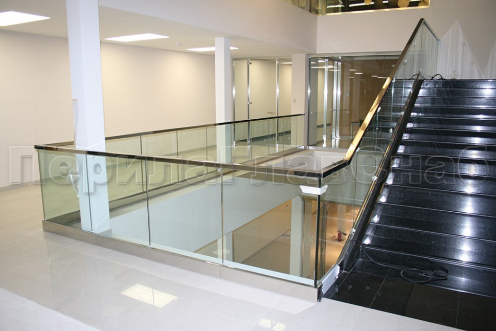 Ограждение с профильным поручнем с пазом на точечном креплении на лестнице