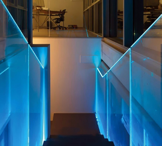 Для лестниц или помещений, где нет строгих требований по количеству света, использование подсветки поручня является эффективным способом экономии  электроэнергии. Посчитайте сами: любая, даже энергосберегающая лампа потребляет более 40 Вт, для освещения нужно как минимум 2 лампы, то есть 80 Вт, при этом 10-ти метровый поручень с подсветкой потребляет всего 50 Вт.