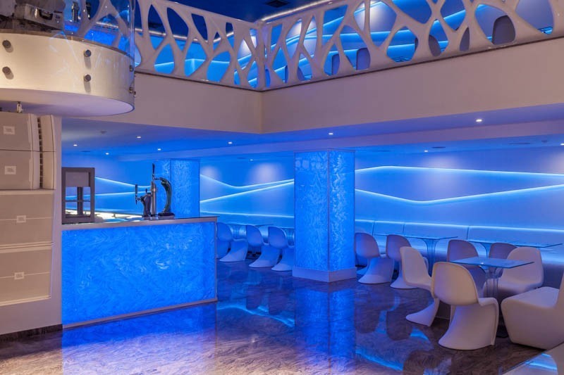 Для создания эффекта объемного свечения всей поверхности несущего стекла используйте матовое стекло (матирование либо химическим травлением, либо пескоструйкой). Неровности, рассеивающие свет с поверхности стекла, создадут иллюзию цельносветящейся стеклянной панели. Очень красиво смотрятся барные стойки, сделанные из несущего триплекса со спрятанным в полу усиленным несущим профилем.