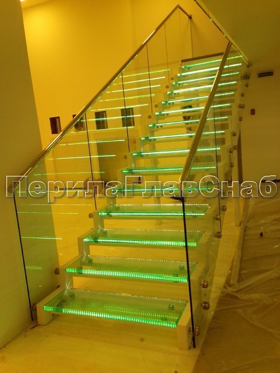 Ограждения лестниц на несущем стекле с подсветкой