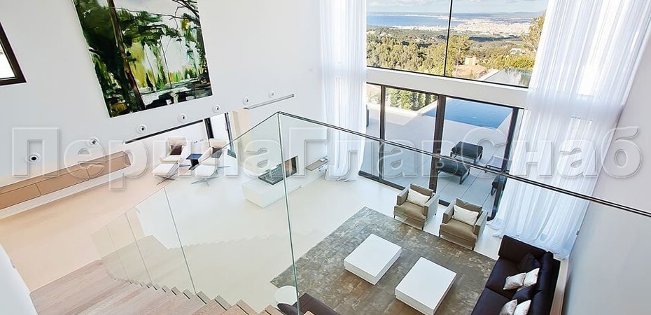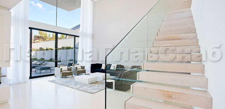 Красивая опция - частичная матировка нижней части несущего стекла (делают обычно там, где стекло примыкает к лестничному маршу или перекрытию).