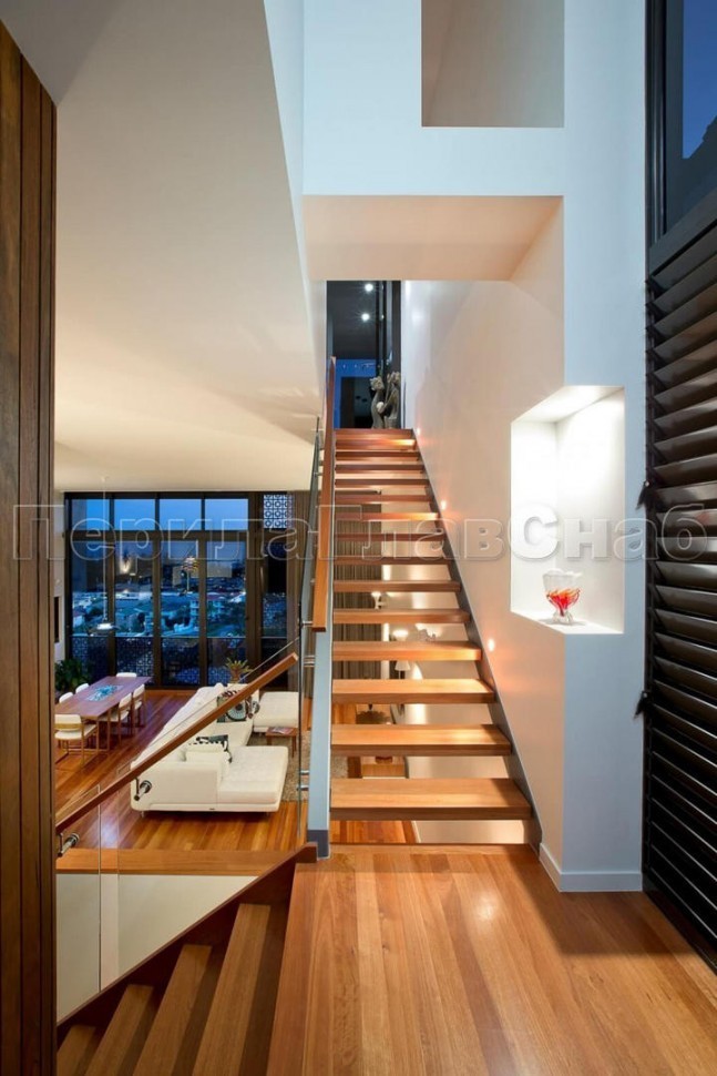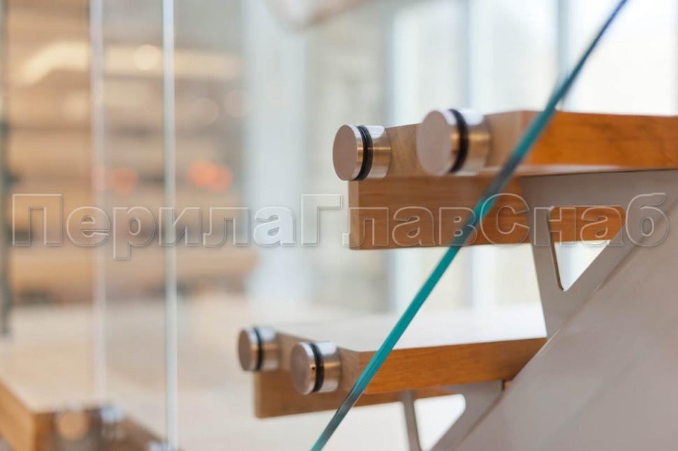 Ограждение с деревянным поручнем на выносе на точечном креплении на лестнице
